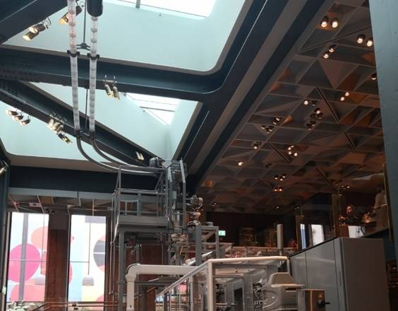 制作好的咖啡豆被頭頂上造型獨(dú)特的管子直接輸送到售賣的玻璃盒里